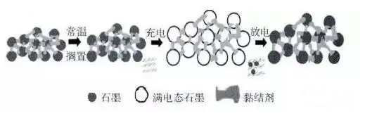 石墨負極極片在放置、充放電過程中的結構變化示意圖